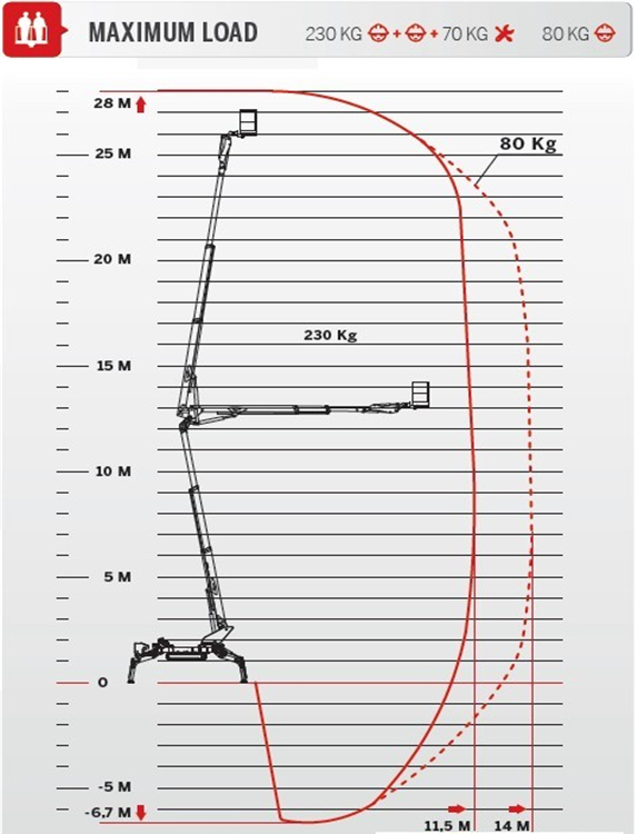 四个稳定区域,两种工作区域 ,稳定系统,可在任何地形内使用,能够到达最难接近的区域。最大工作高度28米,工作半径14米,地下可达6.7米。无与伦比的工作平台