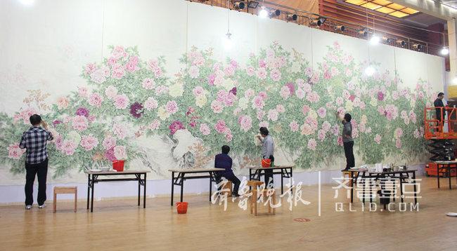 工笔画前期工作非常繁琐,需要先确定骨架。 历时77天九易其稿 218朵牡丹有寓意 趴地上画、站着画、蹲着画、在升降机上画、趴桌子上画…… 《花开盛世》大型工笔牡丹画,是中国传统工笔画,宽15.5米、高4.2米,是目前国内乃至世界上最大的工笔牡丹画、最大的工笔画。