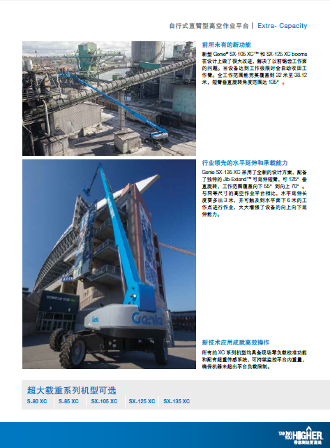 生产力简单化 从地面到空中,重新设计的S™-80和S™-85使得您想到达任何可能的地方都简单化。带有8英尺2英寸(2.50米)宽的固定轴只需68秒就能从地面升到全高处,并且我们特有的虚拟枢轴臂,使您在工地上能轻易的选择S™-80和S™-85。加上,您有三种发电机组的选项,他们都能够满足目前EPA和欧洲的排放标准。